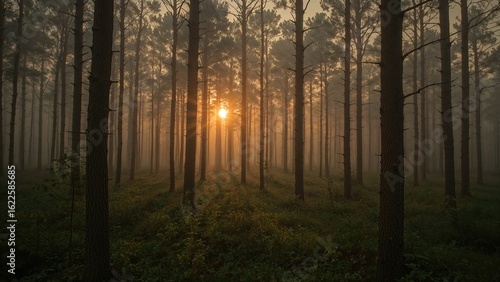Foggy forest scene illuminated by beams of sunlight shining through branches