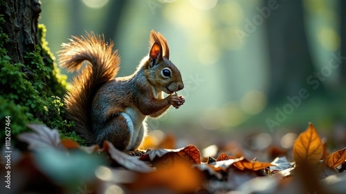 Foggy Forest Squirrel Foraging Closeup - Serene Wildlife Photography