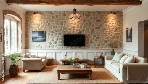 Foggy French Country Stone Wall Living Room with antique white skirting boards for a soft, rustic feel