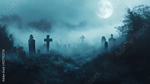 Foggy graveyard filled with ghostly apparitions under a full moon. Haunting Foggy Cemetery. Illustration