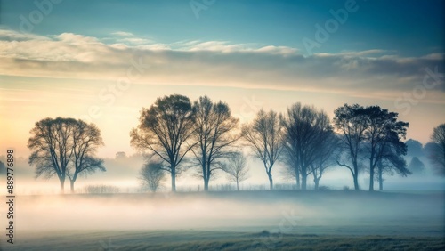 Foggy landscape with silhouettes of trees in the background, fog, mist, hazy, atmospheric, serene, tranquil, moody
