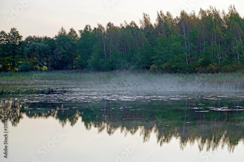 Foggy morning over the lake in September. Indian summer and sunrise. Warm beautiful autumn Landscape.
