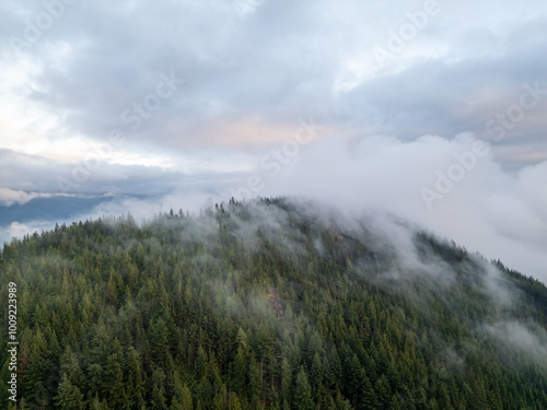 Foggy Mountain in BC, Canada Surrounded by Lush Evergreen Forest Under a Moody Sky