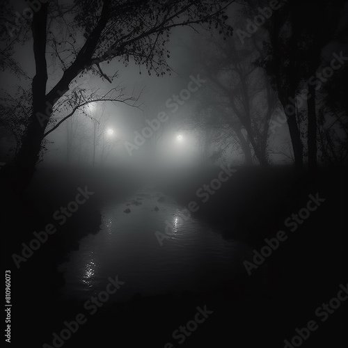 Foggy night bright lights reflecting on a water path, surrounded by dark trees, eerie fog, mysterious and beautiful atmosphere