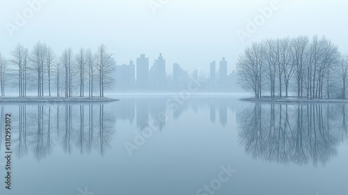 Foggy park lake with city skyline reflection, tranquil winter scene, for serene background, tranquil