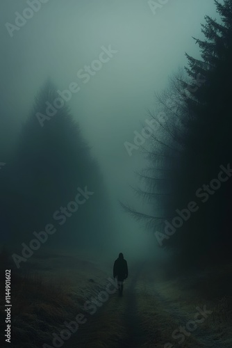 Foggy path, lone figure, dark trees, mysterious scene.