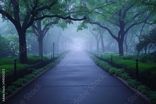 Foggy path through trees with iron fence and streetlights. AI generative. .