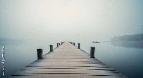 Foggy pier stretches into calm, serene lake Tranquil and ethereal