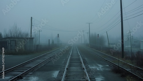 Foggy Railroad Tracks Stretching into the Distance on a Misty Morning