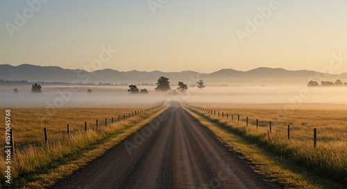 Foggy Rural Road Leading to Distant Mountains at Sunrise Serene Landscape