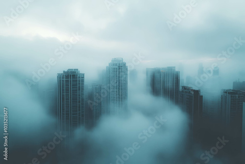 Foggy Skyscraper Skyline With High-Rise Buildings Dissolving Into Mist. Foggy Urban Skyscraper Landscape