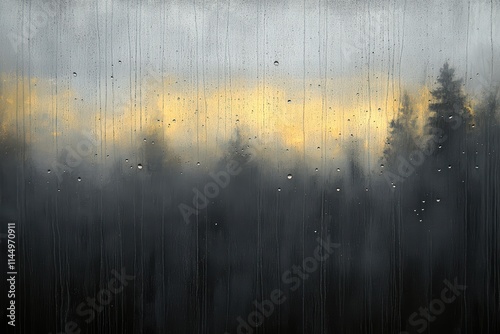 Foggy Window with Raindrops and Sunrise Behind Trees Outdoors