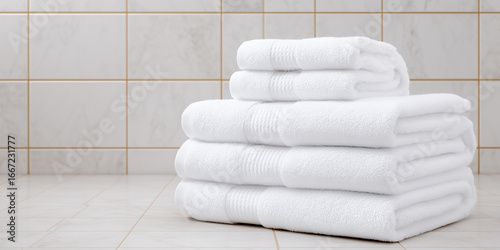 Folded bath towels on a tiled bathroom surface evoking cleanliness hospitality standards wellness and spa readiness