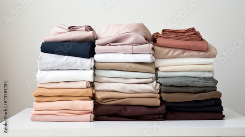 Folded clothes in stacks of various simple colors placed on a table on a white background