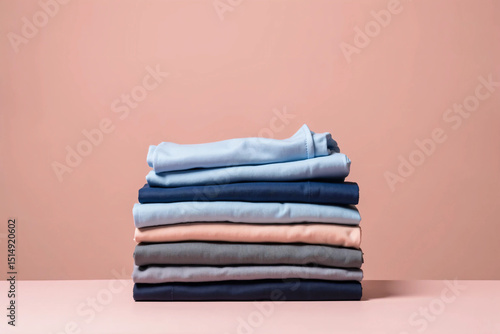 Folded Cotton Shirts in Assorted Colors Stacked with Sunglasses on Top Against a Minimal Background, Displayed with Balanced Lighting and Composition for Fashion, Apparel, and Lifestyle Advertising