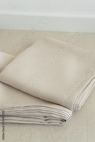 Folded fabric for curtains. Beige curtains.