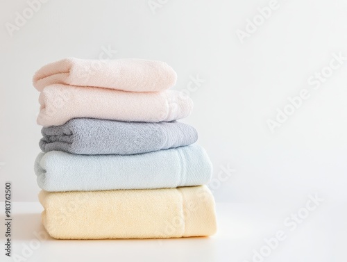 Folded laundry towels in soft pastel tones on a clean white background, household organization