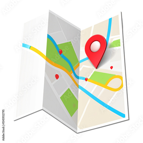 Folded paper map illustration with colorful routes and a red location pin on transparent background.