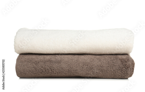 Folded soft terry towels on white background