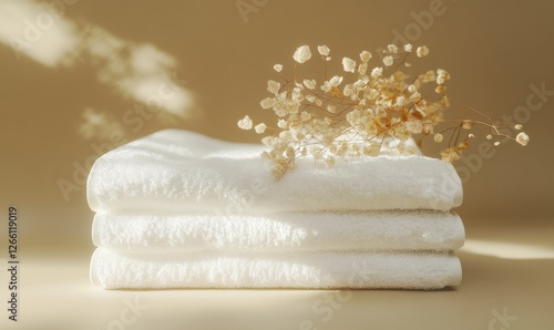 Folded stack of soft white towels with a delicate dried floral arrangement, set on a neutral background for a spa-inspired setting.