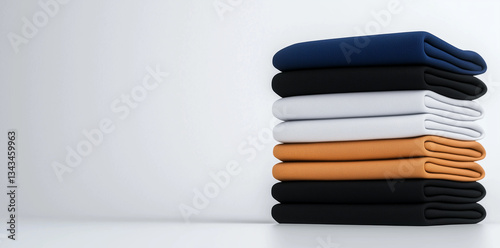 Folded T shirts in various colors stacked neatly on white surface, showcasing modern and minimalist style. arrangement highlights texture and fabric of shirts