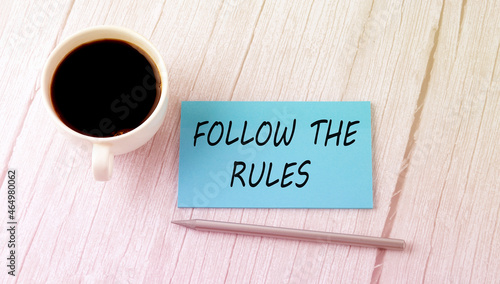 FOLLOW THE RULES text on the blue sticker with cofee and pen