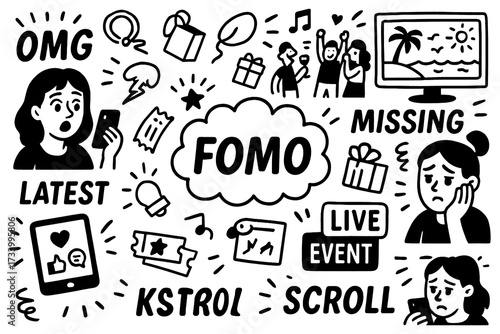 FOMO doodle with anxious faces, phones, social media, parties, missing out and modern lifestyle symbols, Transparent Background