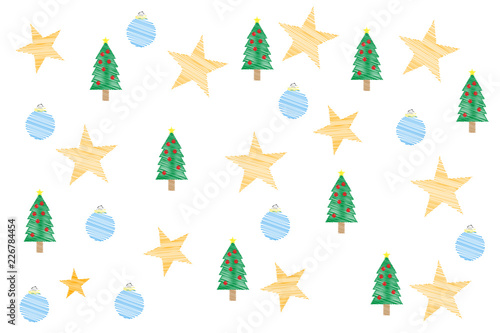 Fondo navideño de pinos, estrellas y bolas de navidad azules.