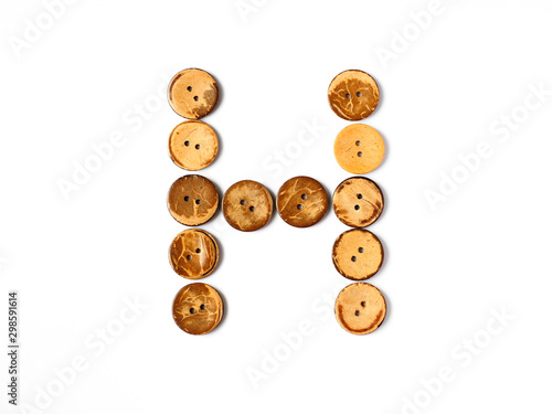 Font H, Alphabet "H" made from Buttons from Coconut shell on white background