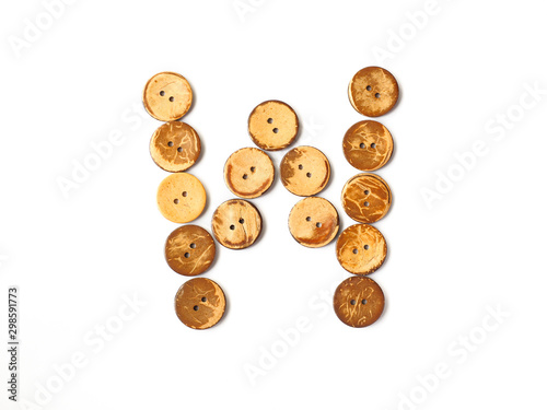 Font W, Alphabet "W" made from Buttons from Coconut shell on white background