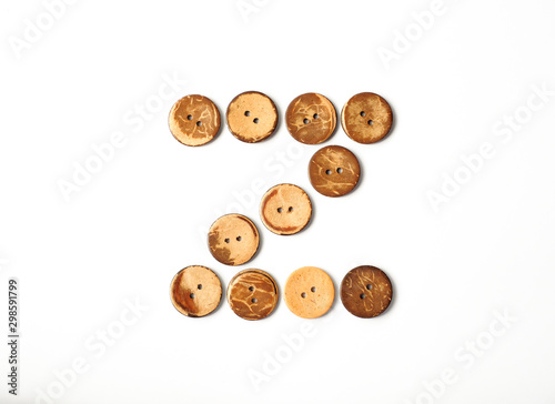 Font Z, Alphabet "Z" made from Buttons from Coconut shell on white background