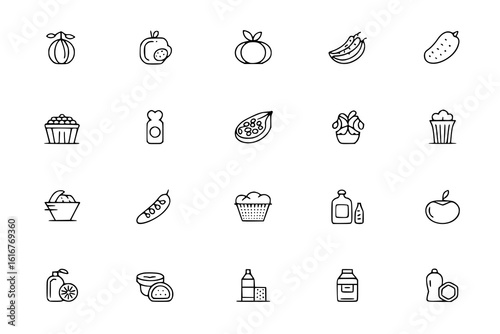 Food & Drink Line Art Icons: A set of 20 minimalist black and white vector illustrations depicting various fruits, vegetables, and food items, perfect for commercial use.