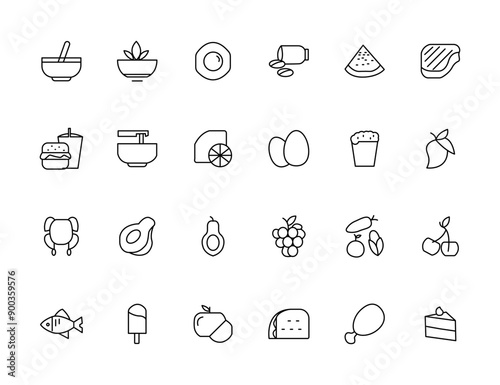 Food and drink icon collection set. Thin outline icons. Meat, milk, noodle, soup, bread, egg, cake, sweets, fruits, vegetables, drinks, nutrition, pizza, fish, sauce, cheese icon