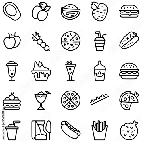 Food and drink set of web icons in line style. Restaurant linear icon collection. Containing meat, fruits, vegetables, desserts, drink, burger, pizza, hot dog,.........