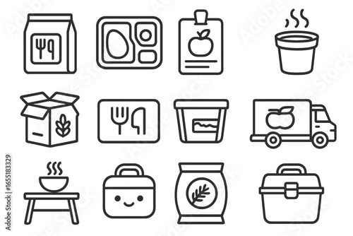 Food Assistance Icons. Line style icons of food and nutrition in relief: meal pack icon, food tray, nutrition card, hot soup