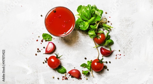 Food background, banner, tomato juice, green basil, cherry tomatoes, garlic, salt, spices. Top view, flat lay