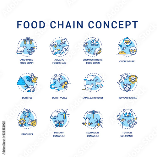 Food chain concept icons set. Primary, secondary and tertiary consumers. Small and top carnivores. Life cycle idea thin line RGB color illustrations. Vector isolated outline drawings. Editable stroke