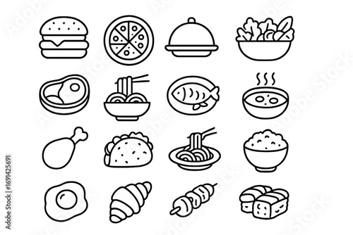 Food cuisine line icon set. Meal and dish outline pictograms. International food collection with burger, pizza, sushi, pasta, taco. For restaurant menu or a cooking app.