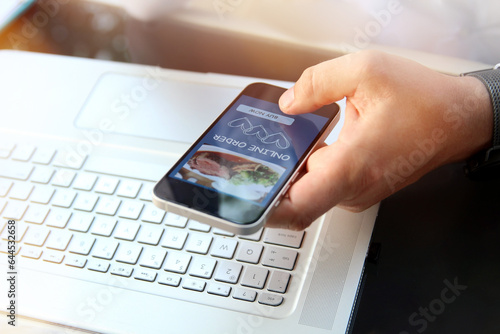 Food Delivery. Businessman Ordering Business Lunch Online On mobile phone Sitting In Office. Restaurant Website, Meals Delivering And Catering Service.