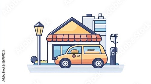 Food delivery car parked outside cafe, city background, urban scene