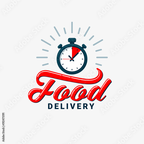 Food delivery icon. Timer and food delivery inscription on light background. Fast delivery, express and urgent shipping, eat mealservices, chronometer sign. Food delivery design.