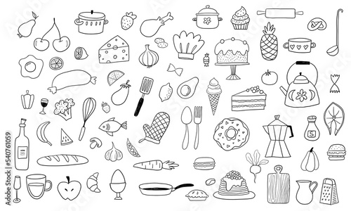 Food doodle hand drawn sketch symbols and objects. Set of kitchen and cooking elements.