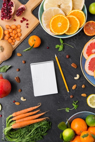 food, healthy eating and diet concept - close up of notebook, fruits and vegetables on slate table top