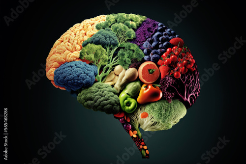 Food in a shape of a brain on dark background. Nutrition concept. Generative AI