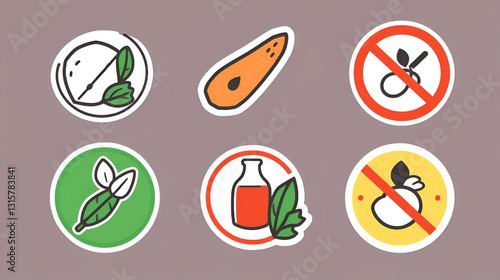 Food ingredients and allergen vector icon set. Gluten, lactose and alcohol free, no preservatives label badge set.