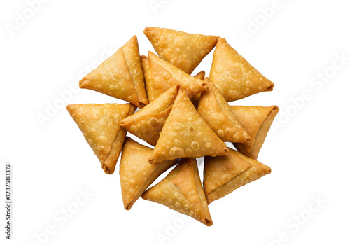 food plate with vegetarian indian samosas, isolated on white background, top view, no depth of field, sharp