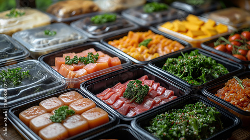 Food preparation in plastic containers on a wooden table. Boxes with different healthy delicious meals daily eats. Fresh products.