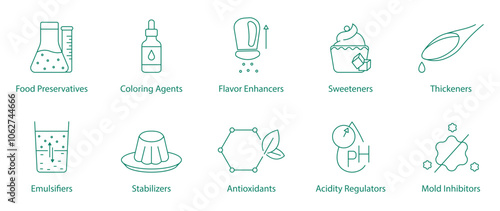 Food Preservatives, Coloring Agents, Flavor Enhancers, Sweetness, Thickness, Emulsifiers, Stabilizers, Antioxidants, Acidity Regulators, Mold Inhibitors Vector Icon Set