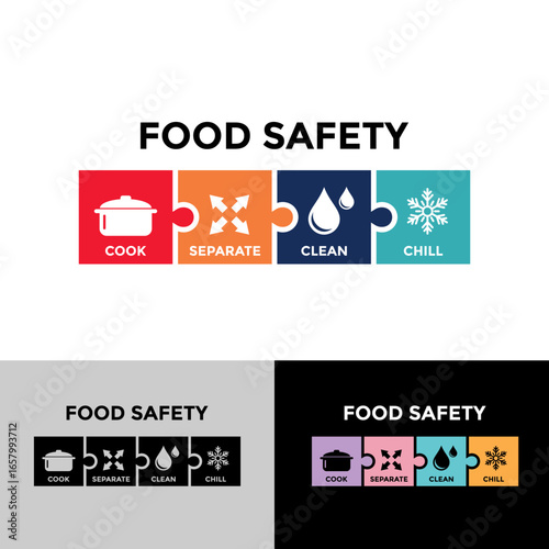 Food safety: Cook, Separate, Clean, and Chill. Presented as puzzle pieces template logo vector. Suitable for educational materials, restaurant posters, kitchen guidelines, or public health campaigns