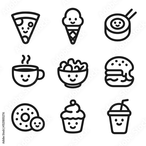 Food Selfie Icons. Outline icon set of food selfies: pizza slice, ice cream cone, sushi roll, coffee cup, salad bowl, burger bite,